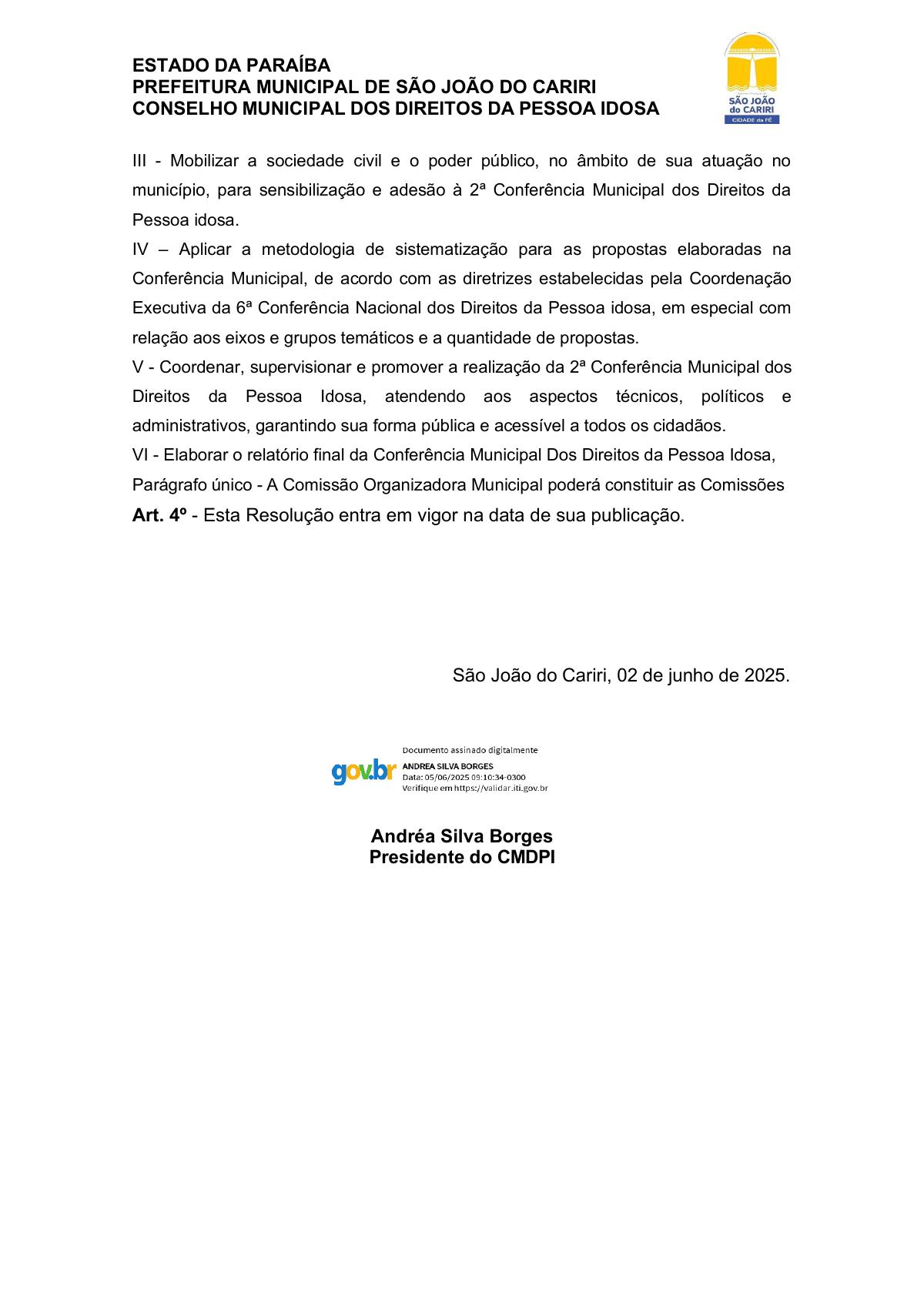 • RESOLUÇÃO Nº 01/2025 – DISPÕE SOBRE A COMISSÃO ORGANIZADORA DA 2ª CONFERÊNCIA MUNICIPAL DOS DIREITOS DA PESSOA IDOSA DO MUNICÍPIO DE SÃO JOÃO DO CARIRI, NO ÂMBITO DA 6ª CONFERÊNCIA NACIONAL DOS DIREITOS DA PESSOA IDOSA.