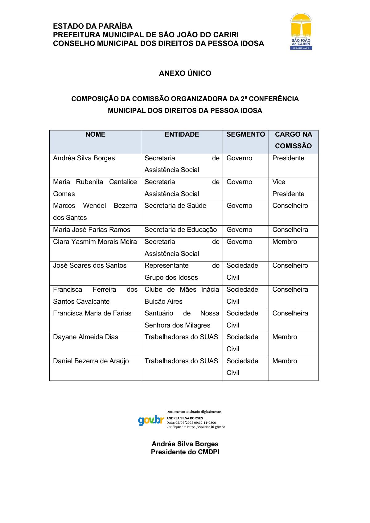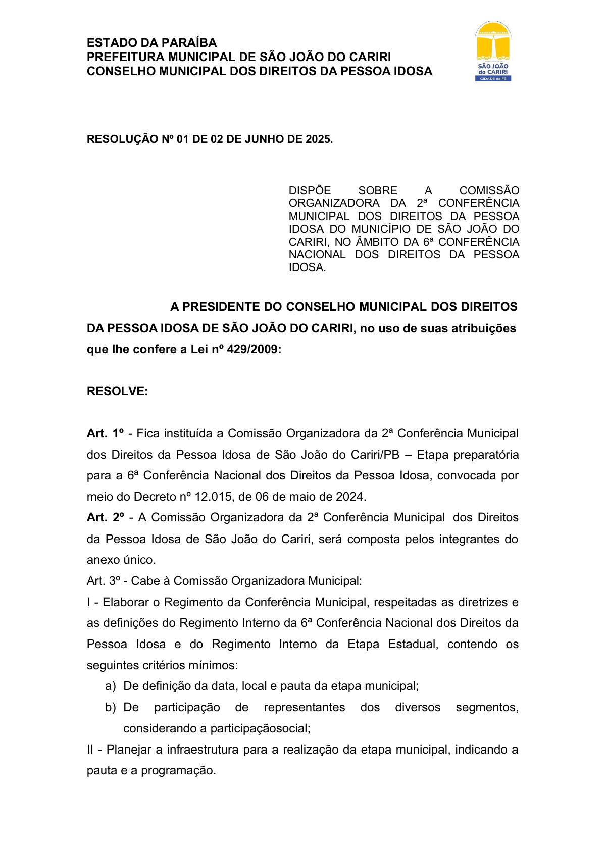 RESOLUÇÃO Nº 01/2025 – DISPÕE SOBRE A COMISSÃO ORGANIZADORA DA 2ª CONFERÊNCIA MUNICIPAL DOS DIREITOS DA PESSOA IDOSA DO MUNICÍPIO DE SÃO JOÃO DO CARIRI, NO ÂMBITO DA 6ª CONFERÊNCIA NACIONAL DOS DIREITOS DA PESSOA IDOSA.