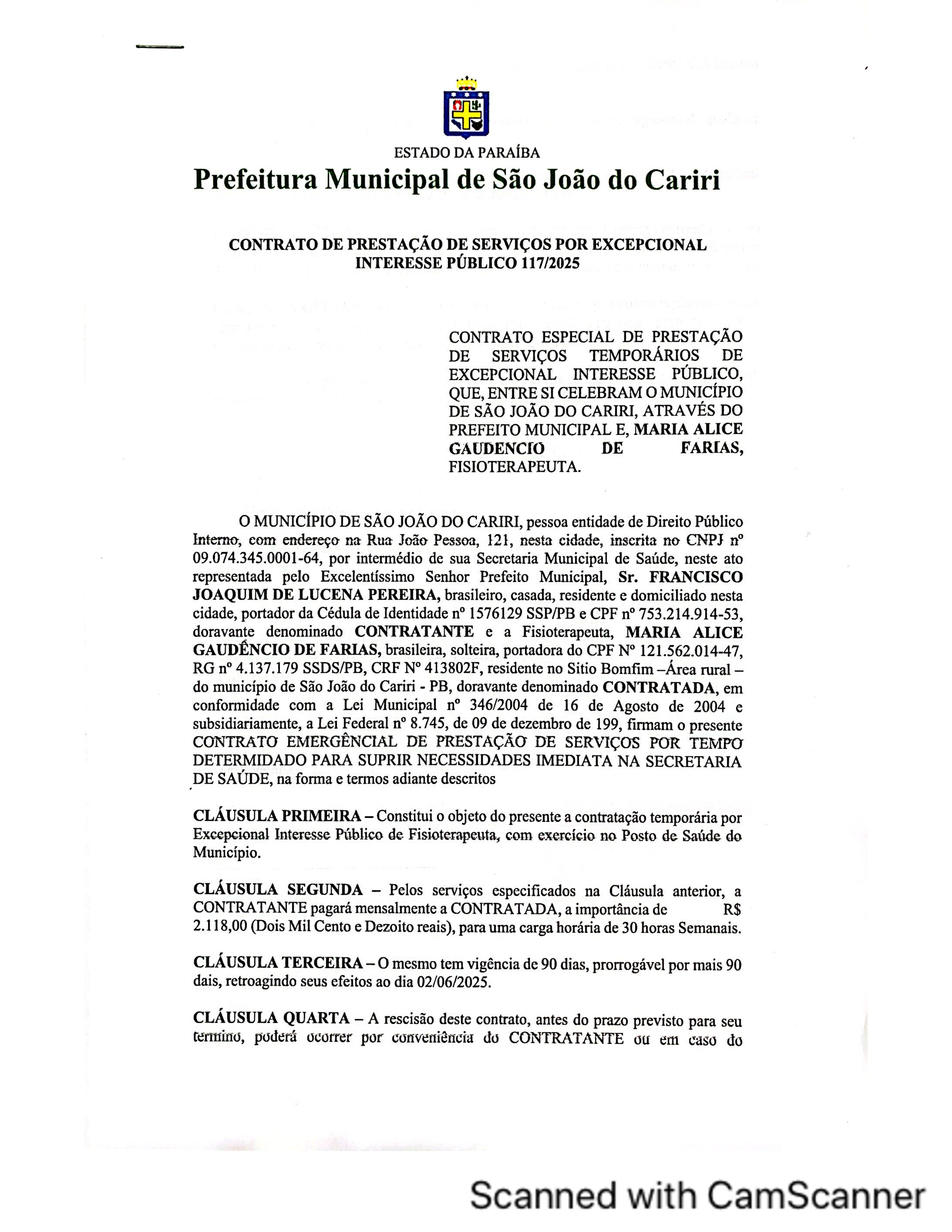 CONTRATO 117/2025 – MARIA ALICE GAUDENCIO DE FARIAS