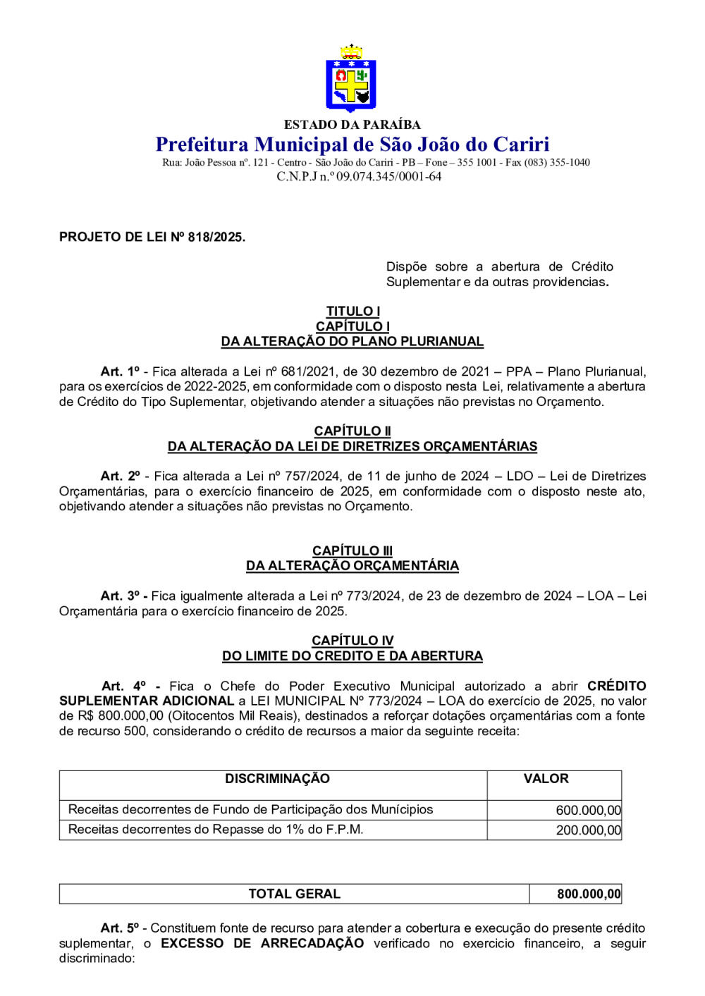 • LEI 818/2025 – DISPÕE SOBRE A ABERTURA DE CRÉDITO SUPLEMENTAR E DA OUTRAS PROVIDENCIAS.