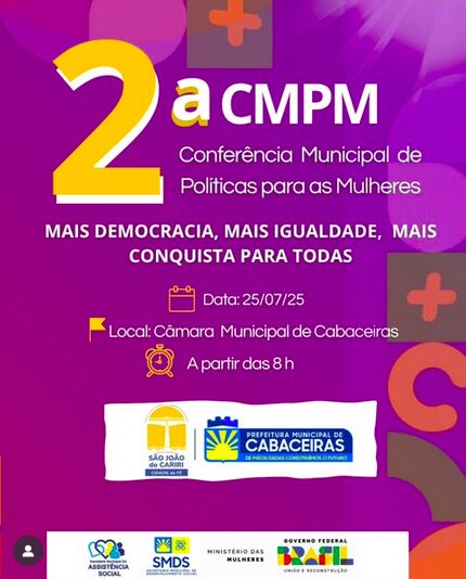 As Secretarias de Desenvolvimento Social de Cabaceiras e São João do Cariri convidam para a 2ª Conferência Municipal de Políticas para as Mulheres, que será realizada no dia 25 de julho, a partir das 8h, na Câmara Municipal de Cabaceiras.