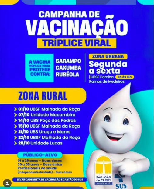 Lembrete importante: a Campanha de Vacinação Tríplice Viral já começou em São João do Cariri!