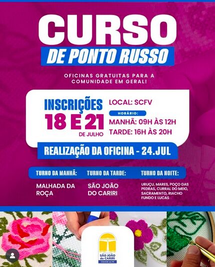 A Prefeitura de São João do Cariri está oferecendo oficinas gratuitas de Ponto Russo abertas a toda comunidade. Uma oportunidade incrível para quem deseja aprender essa técnica artesanal cheia de detalhes e delicadeza.