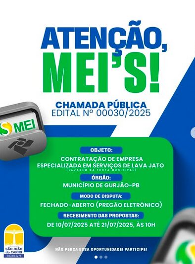 O município de Gurjão-PB está com chamadas públicas abertas para aquisição de utensílios domésticos, óleos e baterias automotivas, além da contratação de serviços de lava jato para a frota municipal.