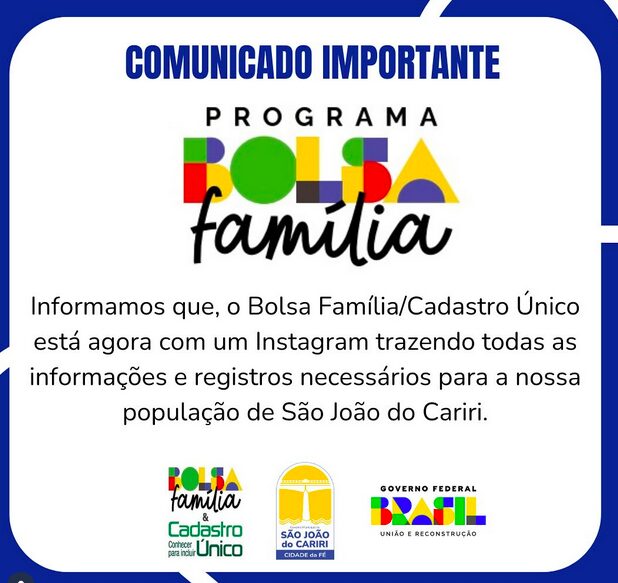 O Instagram do Bolsa Família de São João do Cariri garanti uma comunicação rápida, acessível e oficial entre a gestão local e as famílias beneficiárias, fortalecendo o vínculo comunicativo. @