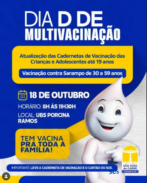 A Gestão Municipal de São João do Cariri através da Secretaria Municipal de Saúde estarão realizando o Dia D de Multivacinação neste sábado dia 18 de Outubro das 8h às 11h30 na UBSF Porcina Ramos localizado na Rua Lourival Ramos.
