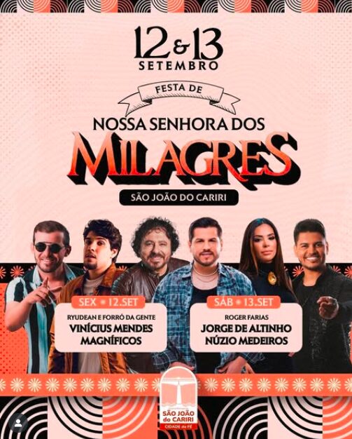 Programação da Festa de Nossa Senhora dos Milagres 2025, será realizada nos dias 12 e 13 de setembro. Será um momento especial para celebrarmos juntos a nossa padroeira e fortalecer a cultura do nosso povo.