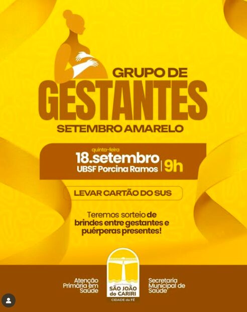 A Secretaria Municipal de Saúde de São João do Cariri convida todas as gestantes para participarem de mais um encontro especial do Grupo de Gestantes, em alusão ao Setembro Amarelo.