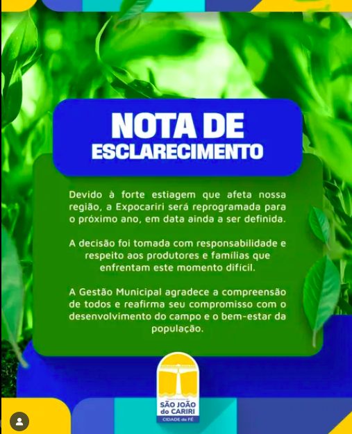A Administração Municipal, em diálogo com produtores, agricultores e demais parceiros, e ciente das dificuldades enfrentadas em virtude da estiagem que atinge nossa região neste ano, comunica que a Expocariri não será realizada conforme o cronograma anteriormente previsto.