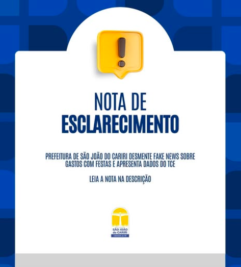A Prefeitura de São João do Cariri vem a público desmentir informações falsas divulgadas por setores da imprensa e compartilhadas nas redes sociais, que apontavam o município como o terceiro do estado que mais gastou com festividades.