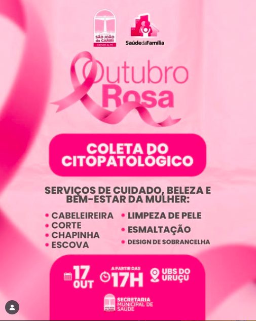 A Gestão Municipal de São João do Cariri através da Secretaria de Saúde estarão realizando amanhã dia 17 de Outubro o MÊS DE COMBATE AO CÂNCER DE MAMA E COLO UTERINO na UBS da Comunidade do Uruçu com início das 17h com os seguintes serviços: