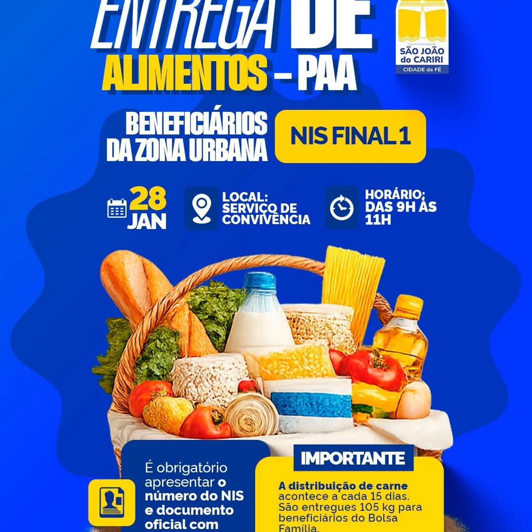 A Prefeitura Municipal de São João do Cariri, por meio do Programa de Aquisição de Alimentos (PAA), informa sobre a próxima rodada de distribuição de alimentos. A ação, voltada para os beneficiários da zona urbana com Número de Identificação Social (NIS) final 1, faz parte dos esforços contínuos para fortalecer a segurança alimentar e nutricional das famílias do município. O objetivo é garantir o acesso a produtos essenciais, promovendo maior bem-estar social à população.