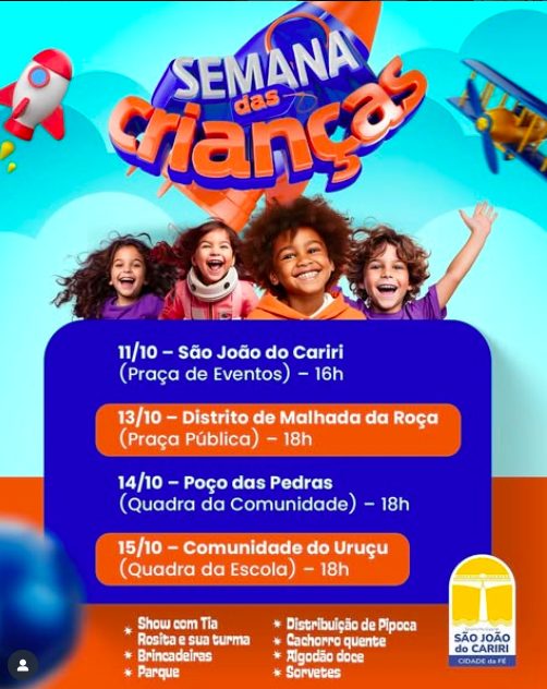 A Gestão Municipal de São João do Cariri através da Secretaria Municipal de Assistência Social convida todas as crianças do nosso município e comunidades para prestigiarem a Semana das Crianças.
